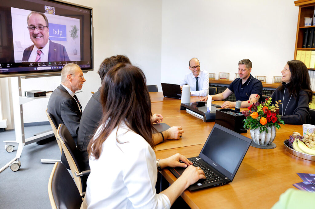Durch regelmäßige Austauschformate (z.B. verschiedene thematische Sprechstunden pro Woche) werden unsere Remote-Kollegen in den Kanzlei-Alltag integriert und stehen im regelmäßigen Austausch mit Chefs und Kollegen.